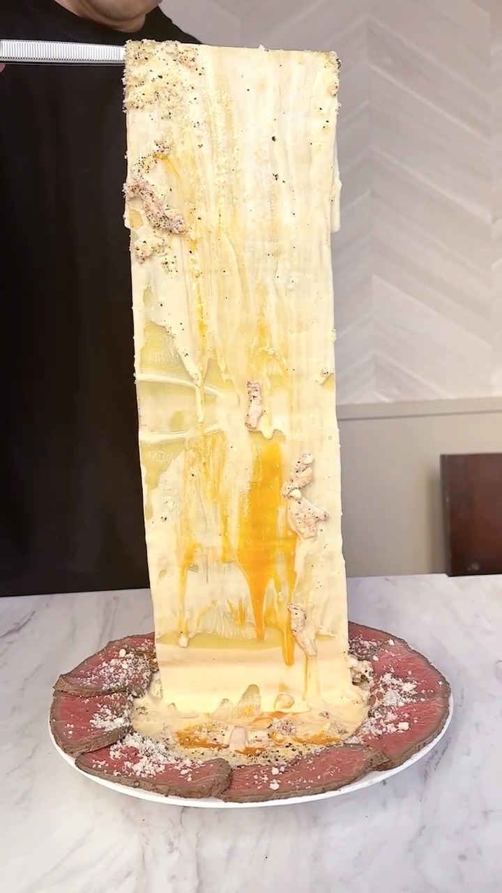 卵黄の下には、一枚麺とゆう帯上のパスタが折りたたんで入っており、麺を持ち上げるときのインパクトはすごいです!味はカルボナーラで、周りのローストされたサーロイン肉と絡めて食べる至極の幸せを是非ご堪能くださいませ。