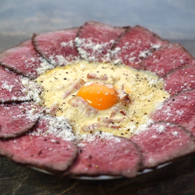卵黄の下には、一枚麺とゆう帯上のパスタが折りたたんで入っており、麺を持ち上げるときのインパクトはすごいです!味はカルボナーラで、周りのローストされたサーロイン肉と絡めて食べる至極の幸せを是非ご堪能くださいませ。