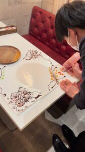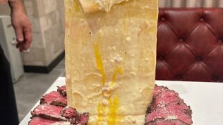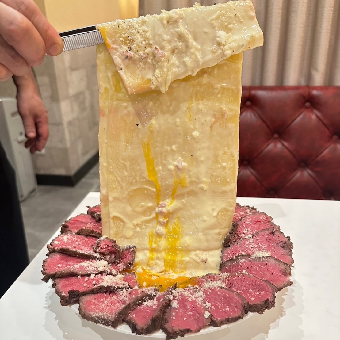 卵黄の下には、一枚麺とゆう帯上のパスタが折りたたんで入っており、麺を持ち上げるときのインパクトはすごいです!味はカルボナーラで、周りのローストされたサーロイン肉と絡めて食べる至極の幸せを是非ご堪能くださいませ。