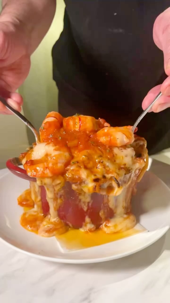 海老の旨みを凝縮させたアメリケーヌソースをパスタに絡ませ、とろとろチーズの上に大ぶりの海老を乗せたエビボルケーノパスタが登場!中にも刻んだ海老がたくさん入ってます!