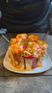 海老の旨みを凝縮させたアメリケーヌソースをパスタに絡ませ、とろとろチーズの上に大ぶりの海老を乗せたエビボルケーノパスタが登場!中にも刻んだ海老がたくさん入ってます!