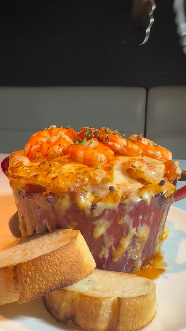 海老の旨みを凝縮させたアメリケーヌソースをパスタに絡ませ、とろとろチーズの上に大ぶりの海老を乗せたエビボルケーノパスタが登場!中にも刻んだ海老がたくさん入ってます!