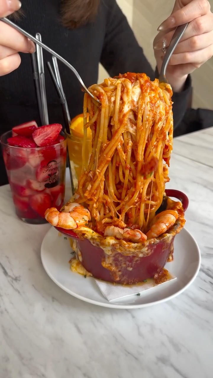 海老の旨みを凝縮させたアメリケーヌソースをパスタに絡ませ、とろとろチーズの上に大ぶりの海老を乗せたエビボルケーノパスタが登場!中にも刻んだ海老がたくさん入ってます!