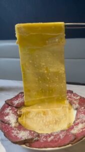 卵黄の下には、一枚麺とゆう帯上のパスタが折りたたんで入っており、麺を持ち上げるときのインパクトはすごいです!味はカルボナーラで、周りのローストされたサーロイン肉と絡めて食べる至極の幸せを是非ご堪能くださいませ。