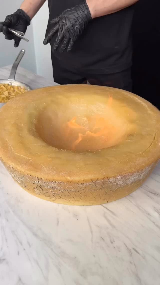 熱々の明太子クリームパスタを12キロの巨大グラナパダーノチーズに乗せてチーズを絡めていきます。明太子丸ごと1本を潰してお召し上がりください。