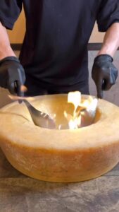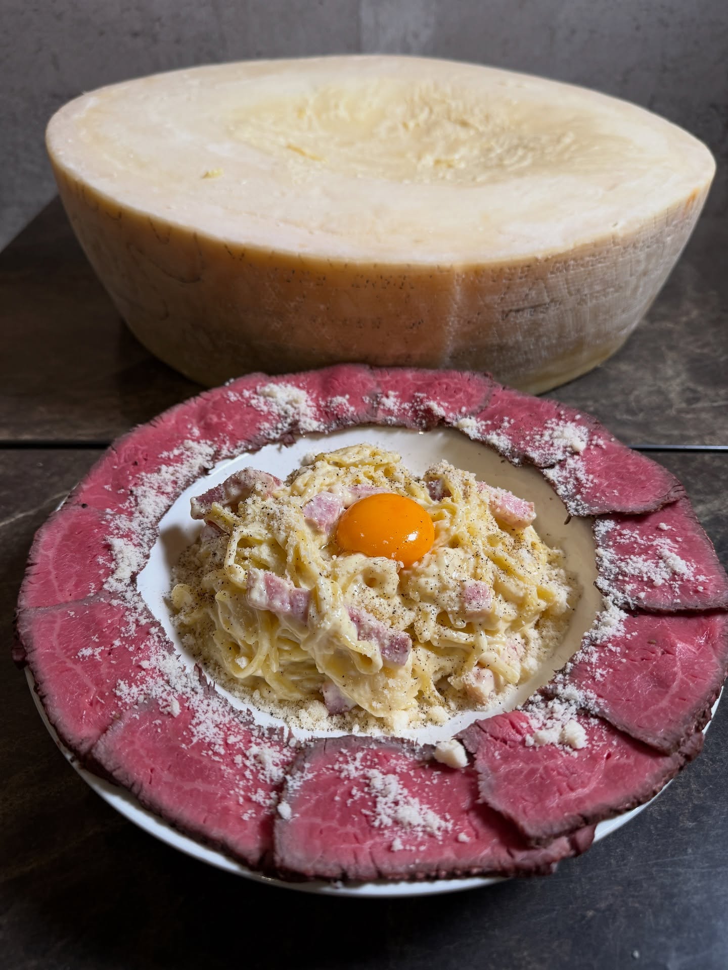 熱々のカルボナーラを12キロの巨大グラナパダーノチーズに乗せてチーズを絡めていきます。北海道産サーロイン肉のローストビーフとからめてお召し上がりください。