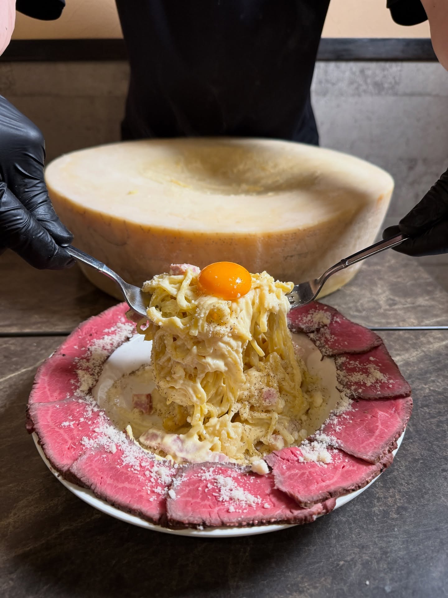 熱々のカルボナーラを12キロの巨大グラナパダーノチーズに乗せてチーズを絡めていきます。北海道産サーロイン肉のローストビーフとからめてお召し上がりください。