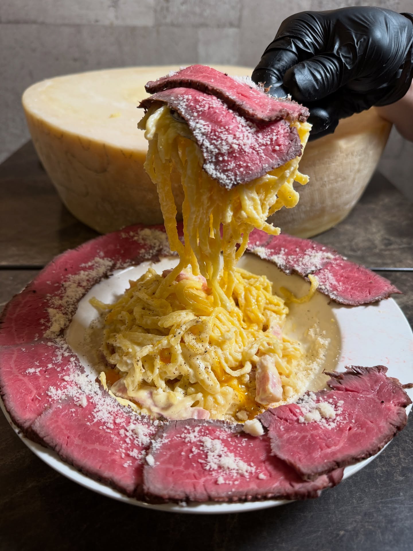 熱々のカルボナーラを12キロの巨大グラナパダーノチーズに乗せてチーズを絡めていきます。北海道産サーロイン肉のローストビーフとからめてお召し上がりください。