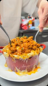 プレスリリース2025年11月1日ボルケーノパスタ ボノネーゼ🧀🧀 チーズの下には、粗挽き肉がゴロゴロ入ったボロネーゼが入っており、太麺にミートソースとチーズが絡んで良い香りが漂います。