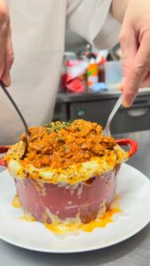 プレスリリース2025年11月5日ボルケーノパスタ ボノネーゼ🧀🧀 チーズの下には、粗挽き肉がゴロゴロ入ったボロネーゼが入っており、太麺にミートソースとチーズが絡んで良い香りが漂います。