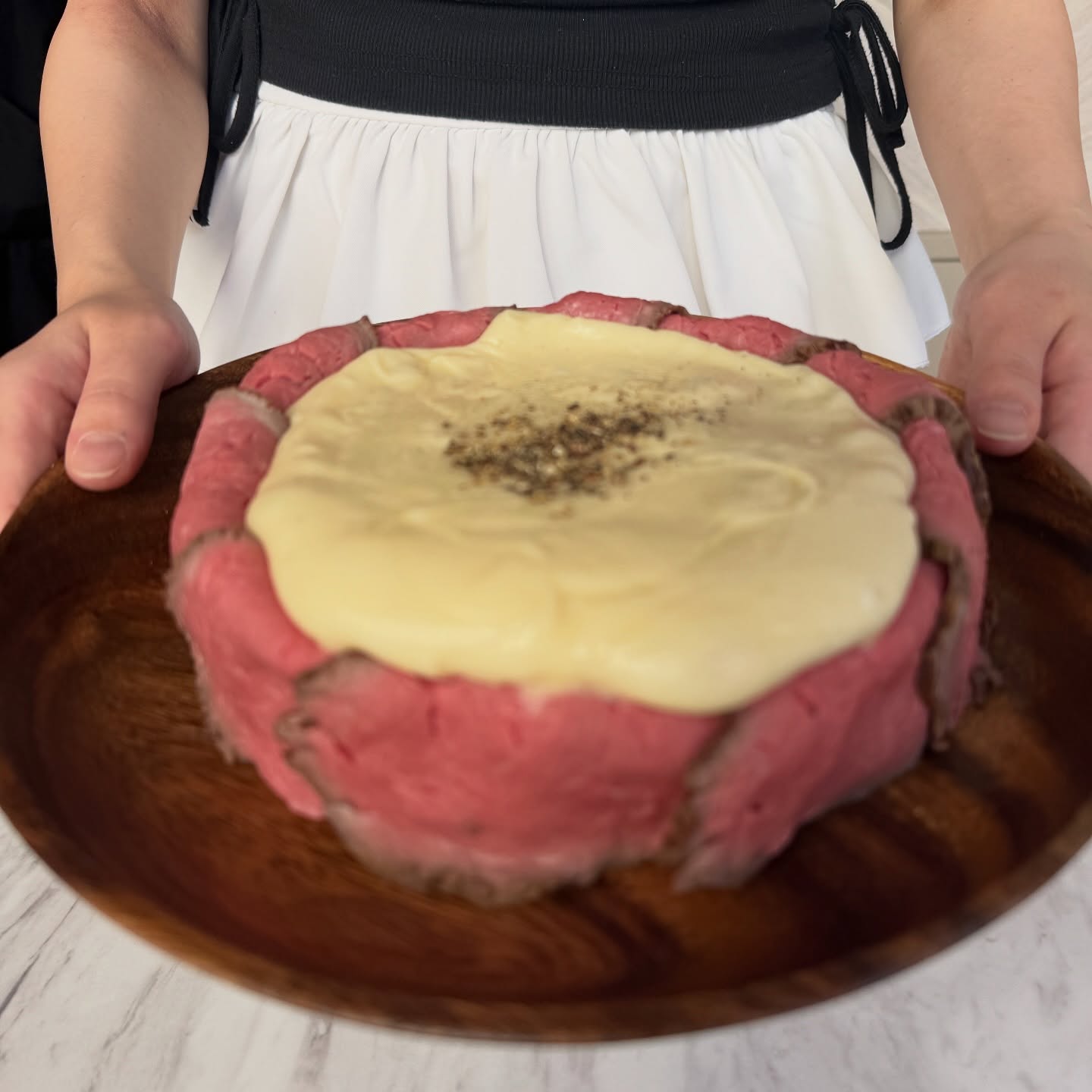 原価率70%をこえる、北海道産サーロイン肉のローストビーフをシカゴピザの周りにのせます。