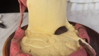 プレスリリース2025年11月5日ボルケーノパスタ ボノネーゼ🧀🧀 チーズの下には、粗挽き肉がゴロゴロ入ったボロネーゼが入っており、太麺にミートソースとチーズが絡んで良い香りが漂います。