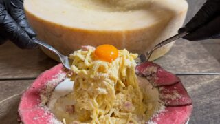 熱々のカルボナーラを12キロの巨大グラナパダーノチーズに乗せてチーズを絡めていきます。北海道産サーロイン肉のローストビーフとからめてお召し上がりください。