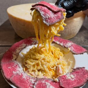プレスリリース2025年11月22日8つ再販売開始🧀 炎の肉ボナーラ! 3900円 2から3名様でお召し上がり頂けるボリュームです!