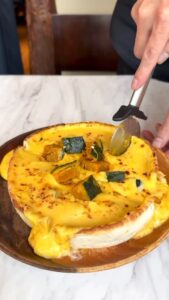 プレスリリース2025年11月28日ボルケーノパスタ ボノネーゼ🧀🧀 チーズの下には、粗挽き肉がゴロゴロ入ったボロネーゼが入っており、太麺にミートソースとチーズが絡んで良い香りが漂います。