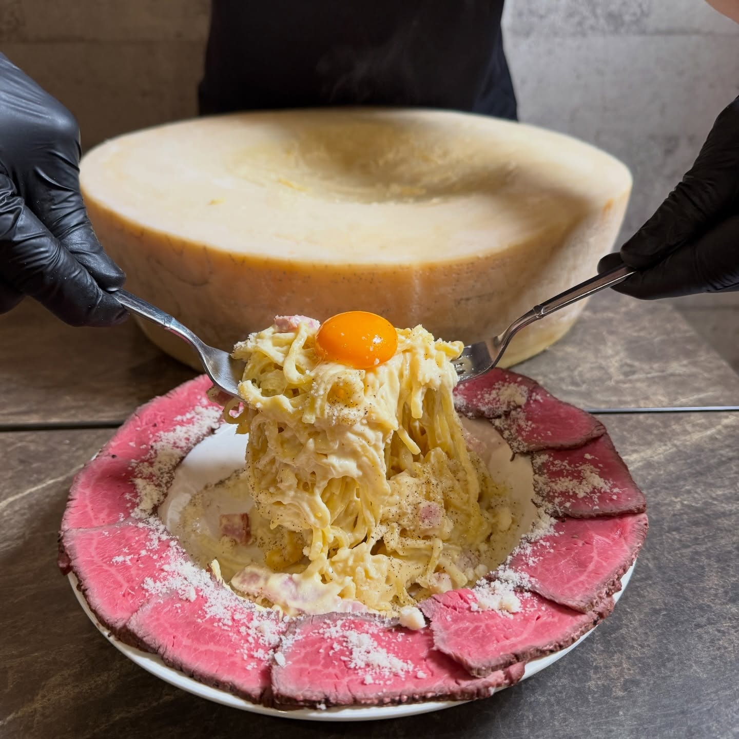 熱々のカルボナーラを12キロの巨大グラナパダーノチーズに乗せてチーズを絡めていきます。北海道産サーロイン肉のローストビーフとからめてお召し上がりください。