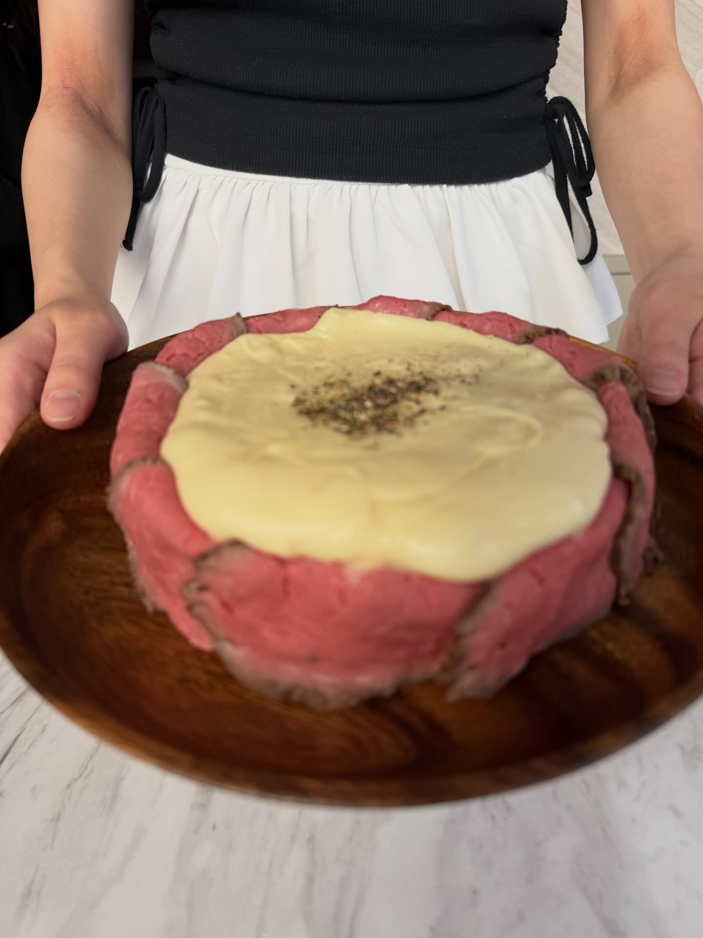 原価率70%をこえる、北海道産サーロイン肉のローストビーフをシカゴピザの周りにのせます。