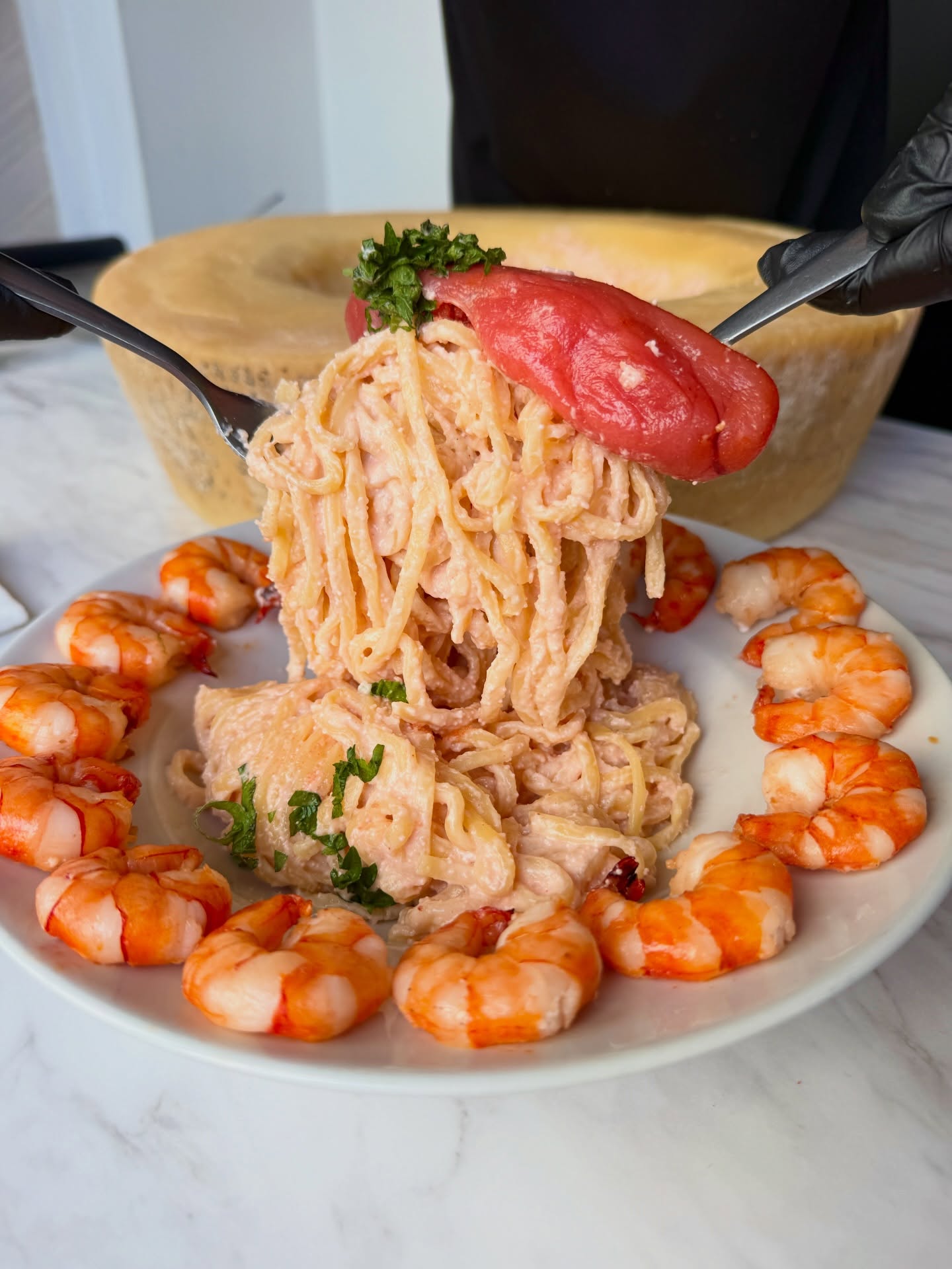 熱々の明太子クリームパスタを12キロの巨大グラナパダーノチーズに乗せてチーズを絡めていきます。明太子丸ごと1本を潰してお召し上がりください。