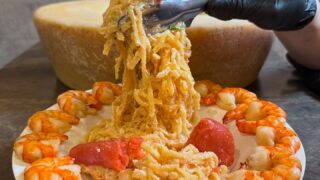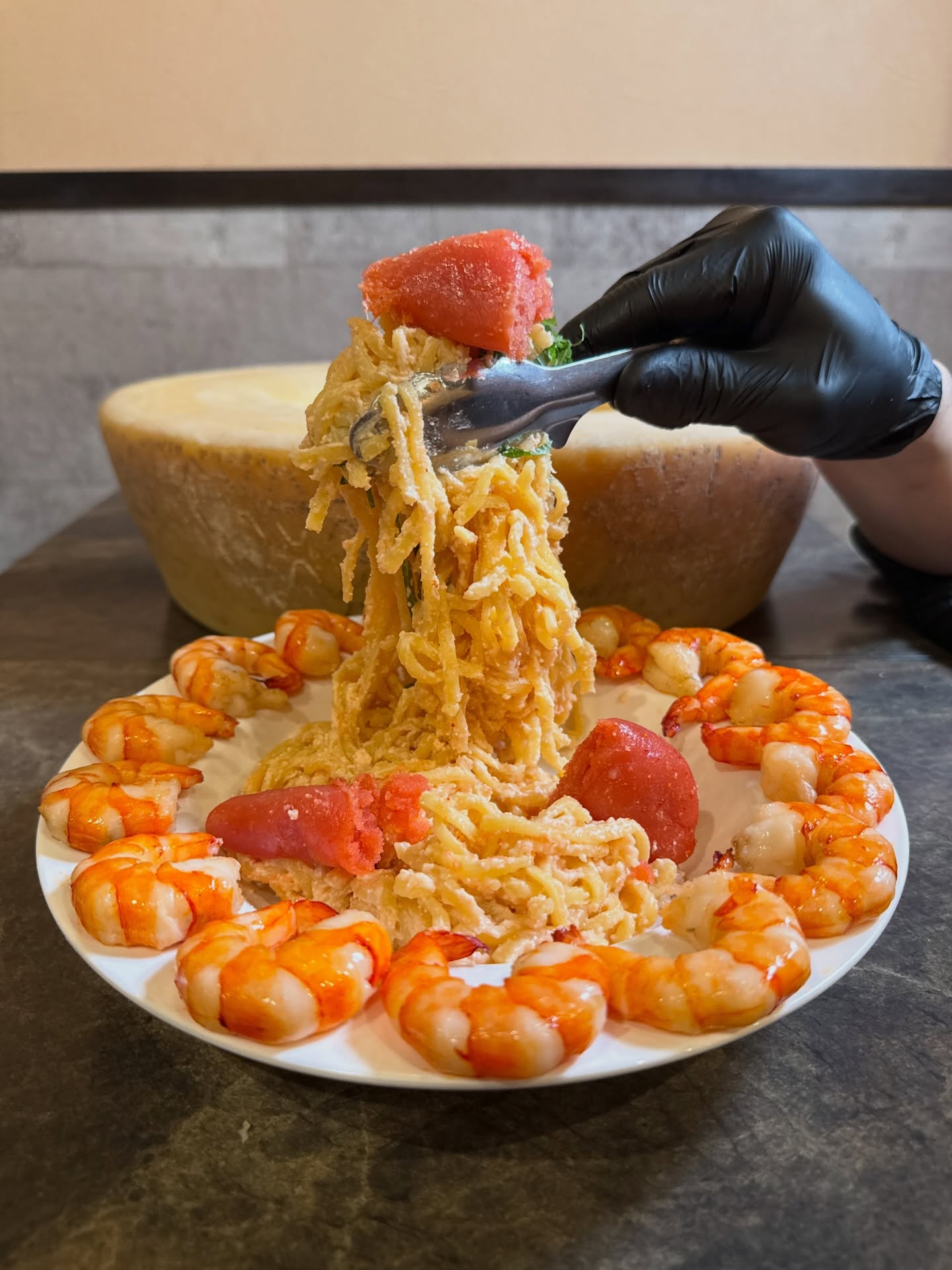 熱々の明太子クリームパスタを12キロの巨大グラナパダーノチーズに乗せてチーズを絡めていきます。明太子丸ごと1本を潰してお召し上がりください。