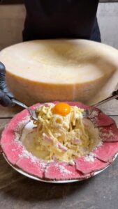 熱々のカルボナーラを12キロの巨大グラナパダーノチーズに乗せてチーズを絡めていきます。北海道産サーロイン肉のローストビーフとからめてお召し上がりください。