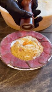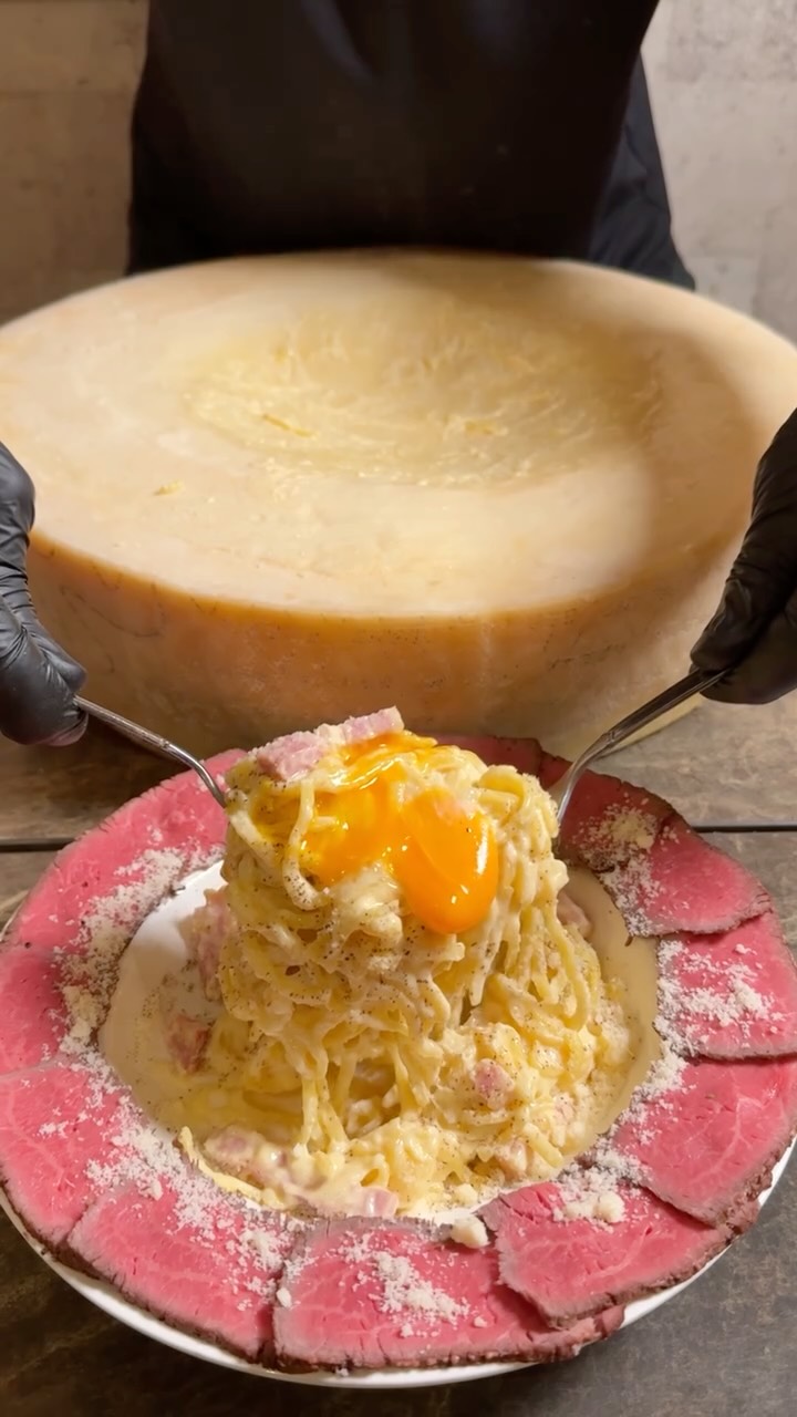 熱々のカルボナーラを12キロの巨大グラナパダーノチーズに乗せてチーズを絡めていきます。北海道産サーロイン肉のローストビーフとからめてお召し上がりください。
