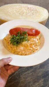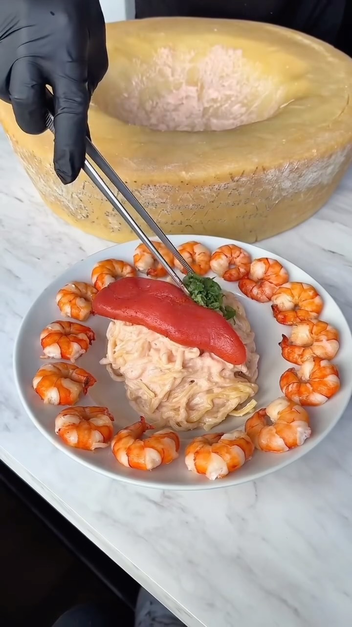 熱々の明太子クリームパスタを12キロの巨大グラナパダーノチーズに乗せてチーズを絡めていきます。明太子丸ごと1本を潰してお召し上がりください。