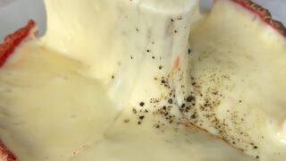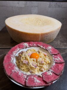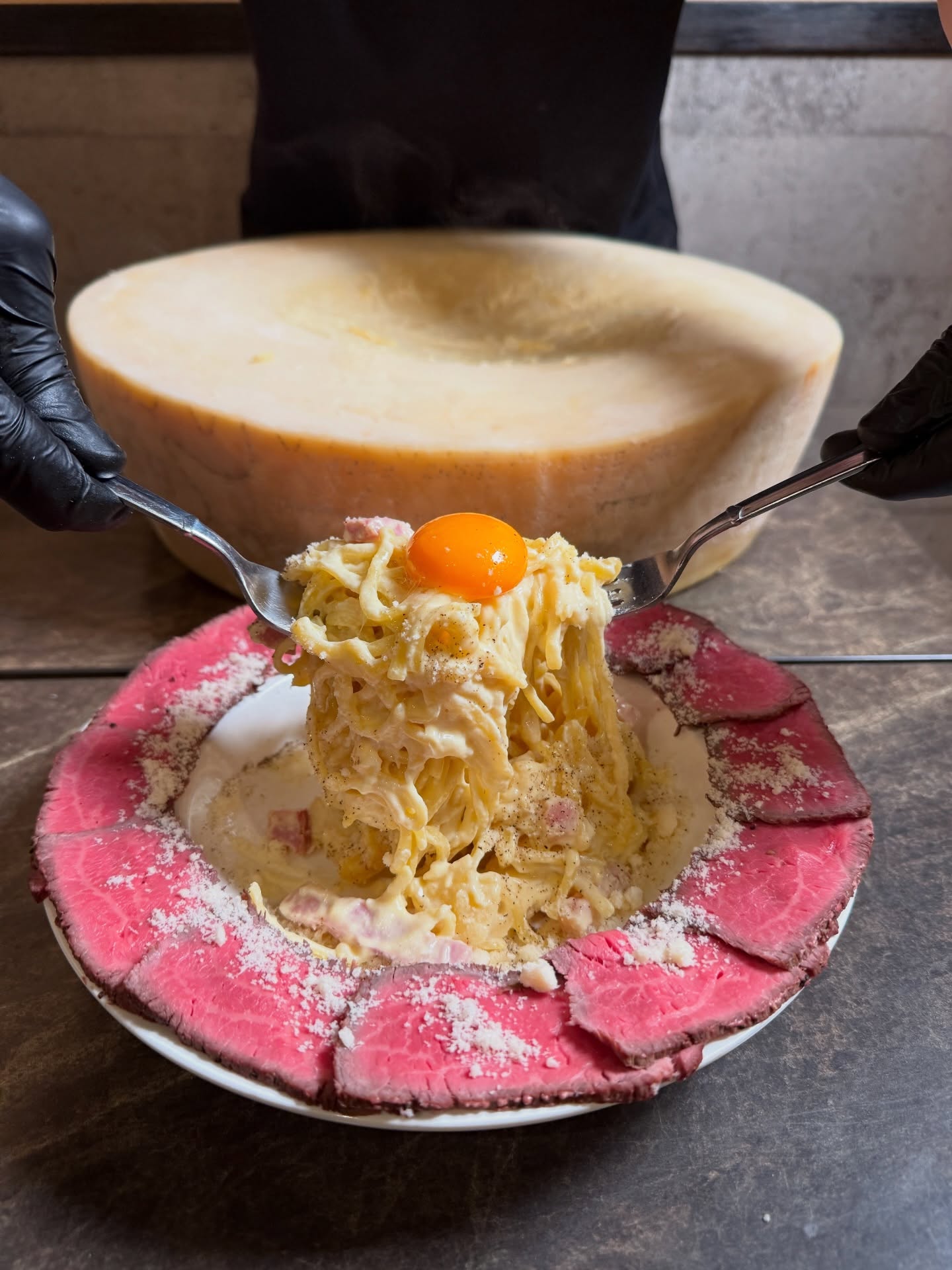 熱々のカルボナーラを12キロの巨大グラナパダーノチーズに乗せてチーズを絡めていきます。北海道産サーロイン肉のローストビーフとからめてお召し上がりください。