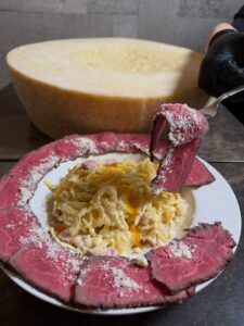 プレスリリース2026年2月16日炎の肉ボナーラ! 3900円 2から3名様でお召し上がり頂けるボリュームです! 熱々のカルボナーラを12キロの巨大グラナパダーノチーズに乗せてチーズを絡めていきます。北海道産サーロイン肉のローストビーフとからめてお召し上がりください。