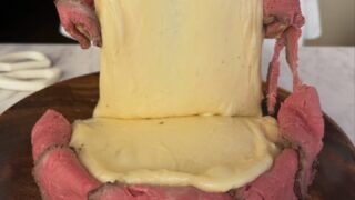 プレスリリース2026年3月7日炎の肉ボナーラ! 3900円 2から3名様でお召し上がり頂けるボリュームです! 熱々のカルボナーラを12キロの巨大グラナパダーノチーズに乗せてチーズを絡めていきます。北海道産サーロイン肉のローストビーフとからめてお召し上がりください。