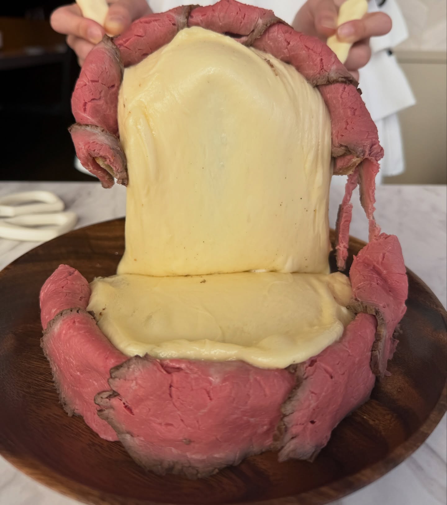 原価率70%をこえる、北海道産サーロイン肉のローストビーフをシカゴピザの周りにのせます。