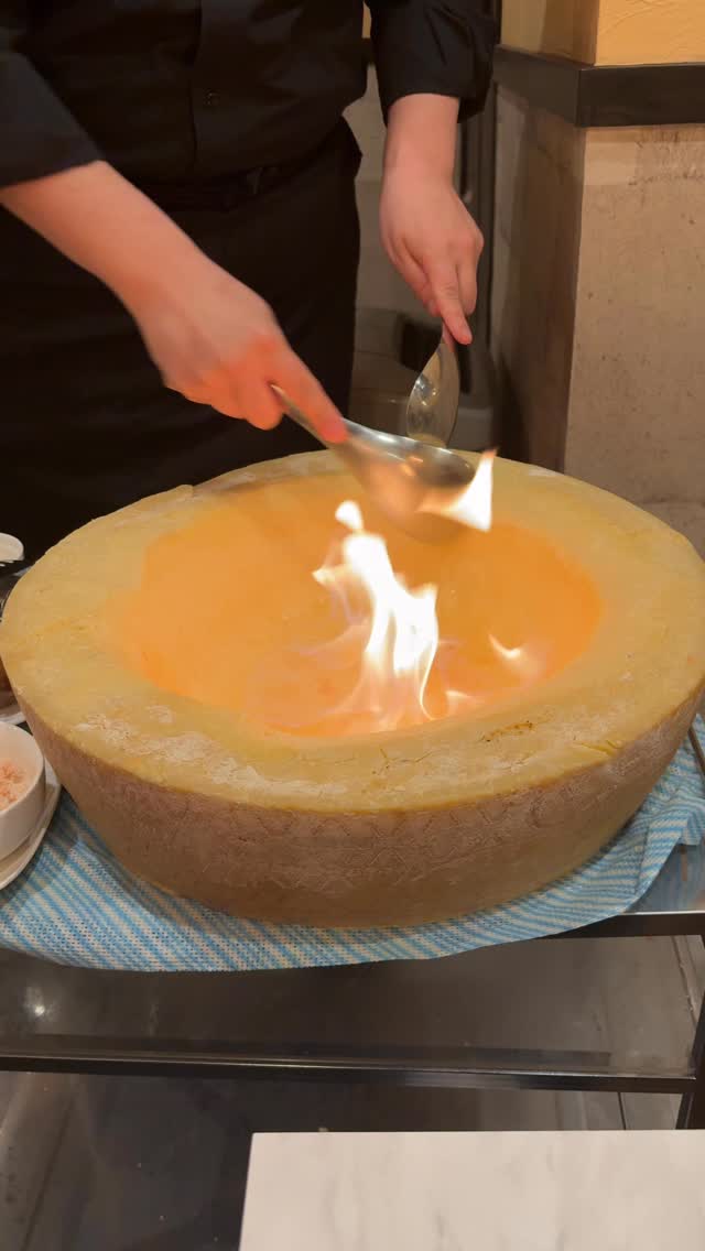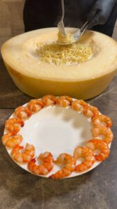 熱々のカニカルボナーラを12キロの巨大グラナパダーノチーズに乗せてチーズを絡めていきます。
