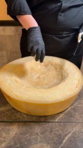 熱々のカニカルボナーラを12キロの巨大グラナパダーノチーズに乗せてチーズを絡めていきます。