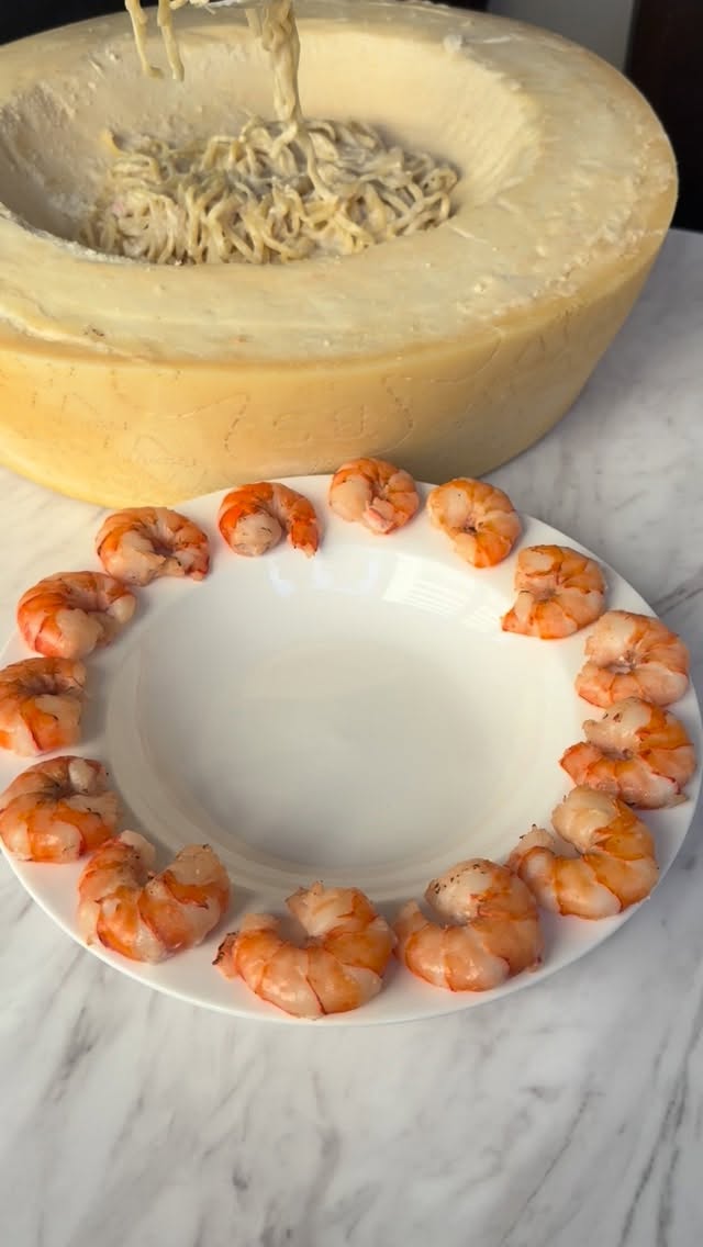 熱々のカニカルボナーラを12キロの巨大グラナパダーノチーズに乗せてチーズを絡めていきます。