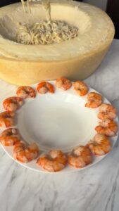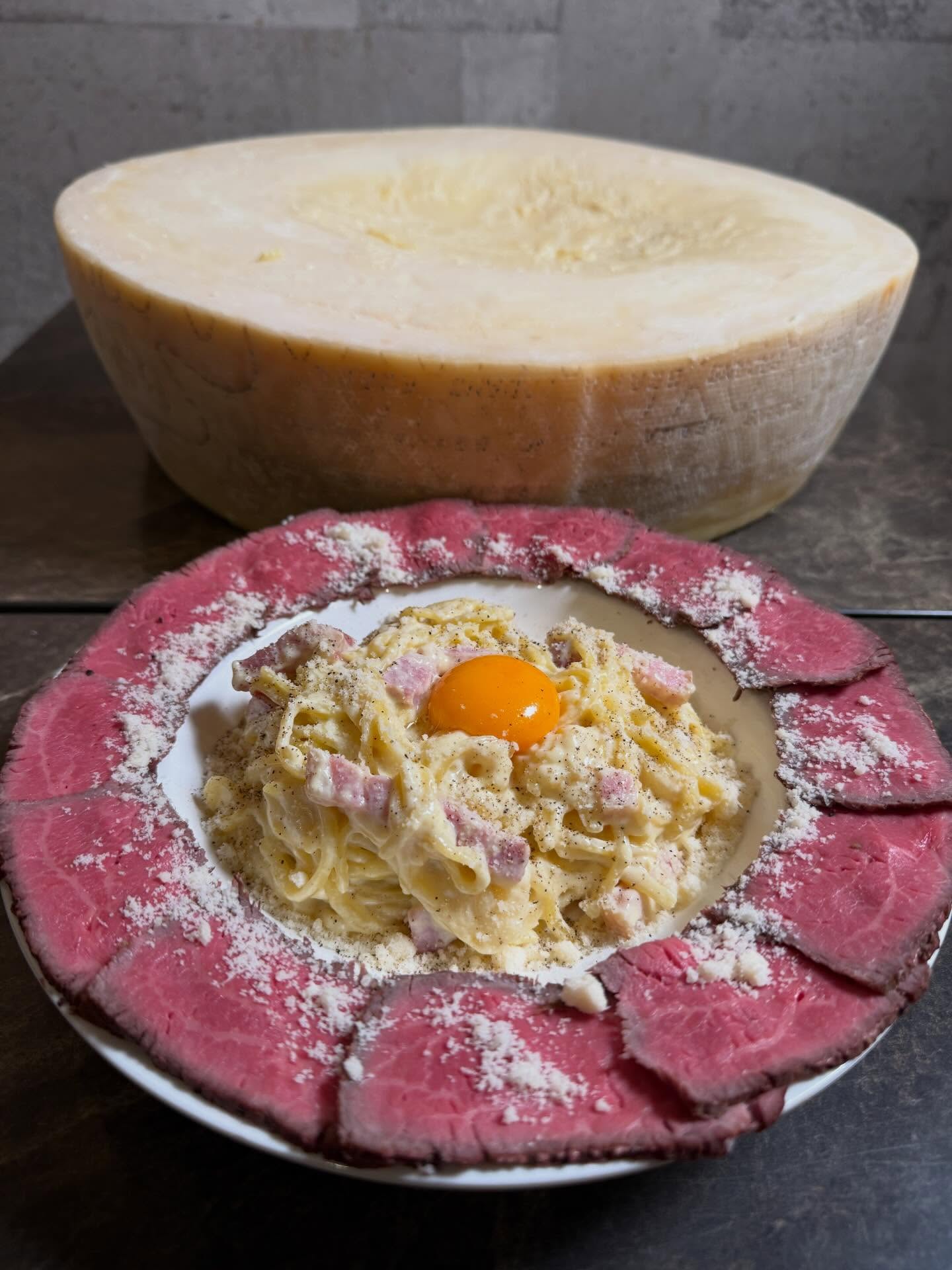 熱々のカルボナーラを12キロの巨大グラナパダーノチーズに乗せてチーズを絡めていきます。北海道産サーロイン肉のローストビーフとからめてお召し上がりください。