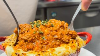 プレスリリース2025年11月3日ボルケーノパスタ ボノネーゼ🧀🧀 チーズの下には、粗挽き肉がゴロゴロ入ったボロネーゼが入っており、太麺にミートソースとチーズが絡んで良い香りが漂います。