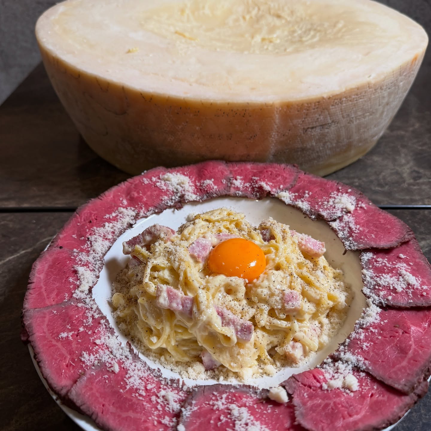 熱々のカルボナーラを12キロの巨大グラナパダーノチーズに乗せてチーズを絡めていきます。北海道産サーロイン肉のローストビーフとからめてお召し上がりください。