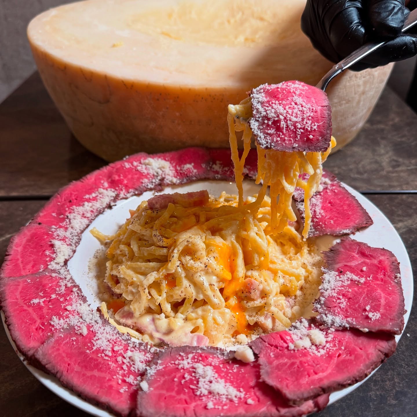 熱々のカルボナーラを12キロの巨大グラナパダーノチーズに乗せてチーズを絡めていきます。北海道産サーロイン肉のローストビーフとからめてお召し上がりください。