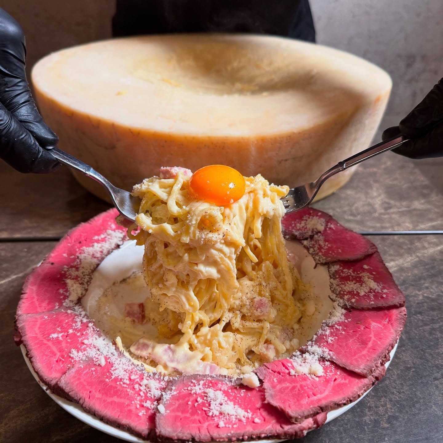 熱々の明太子クリームパスタを12キロの巨大グラナパダーノチーズに乗せてチーズを絡めていきます。明太子丸ごと1本を潰してお召し上がりください。