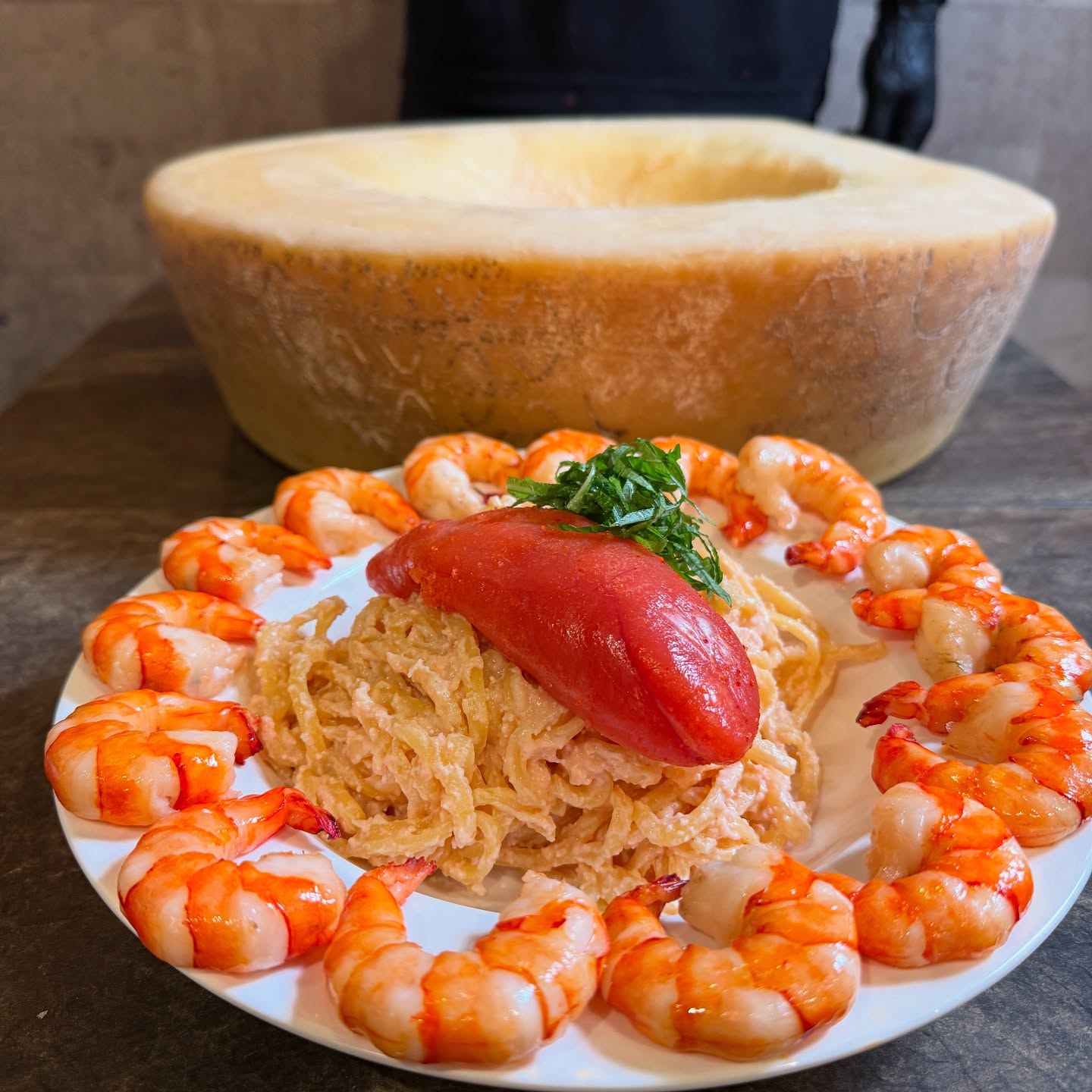 Hot mentaiko cream pasta is placed on 12 kg of giant granapadano cheese and tossed with cheese. Please crush a whole mentaiko to serve.
