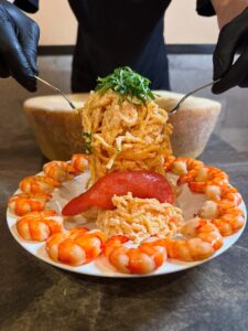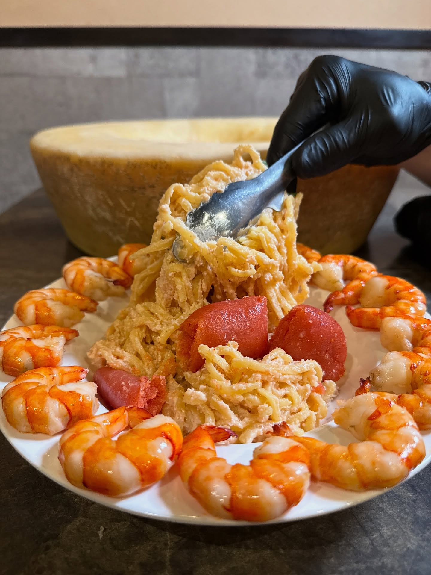 熱々の明太子クリームパスタを12キロの巨大グラナパダーノチーズに乗せてチーズを絡めていきます。明太子丸ごと1本を潰してお召し上がりください。