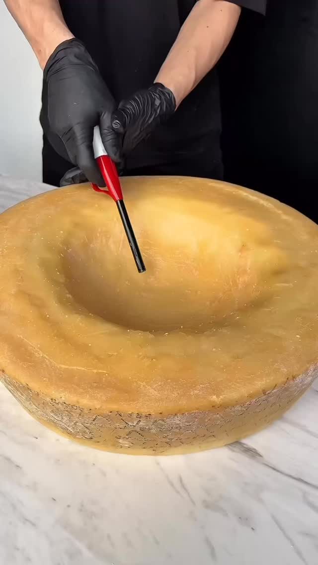 熱々の明太子クリームパスタを12キロの巨大グラナパダーノチーズに乗せてチーズを絡めていきます。明太子丸ごと1本を潰してお召し上がりください。