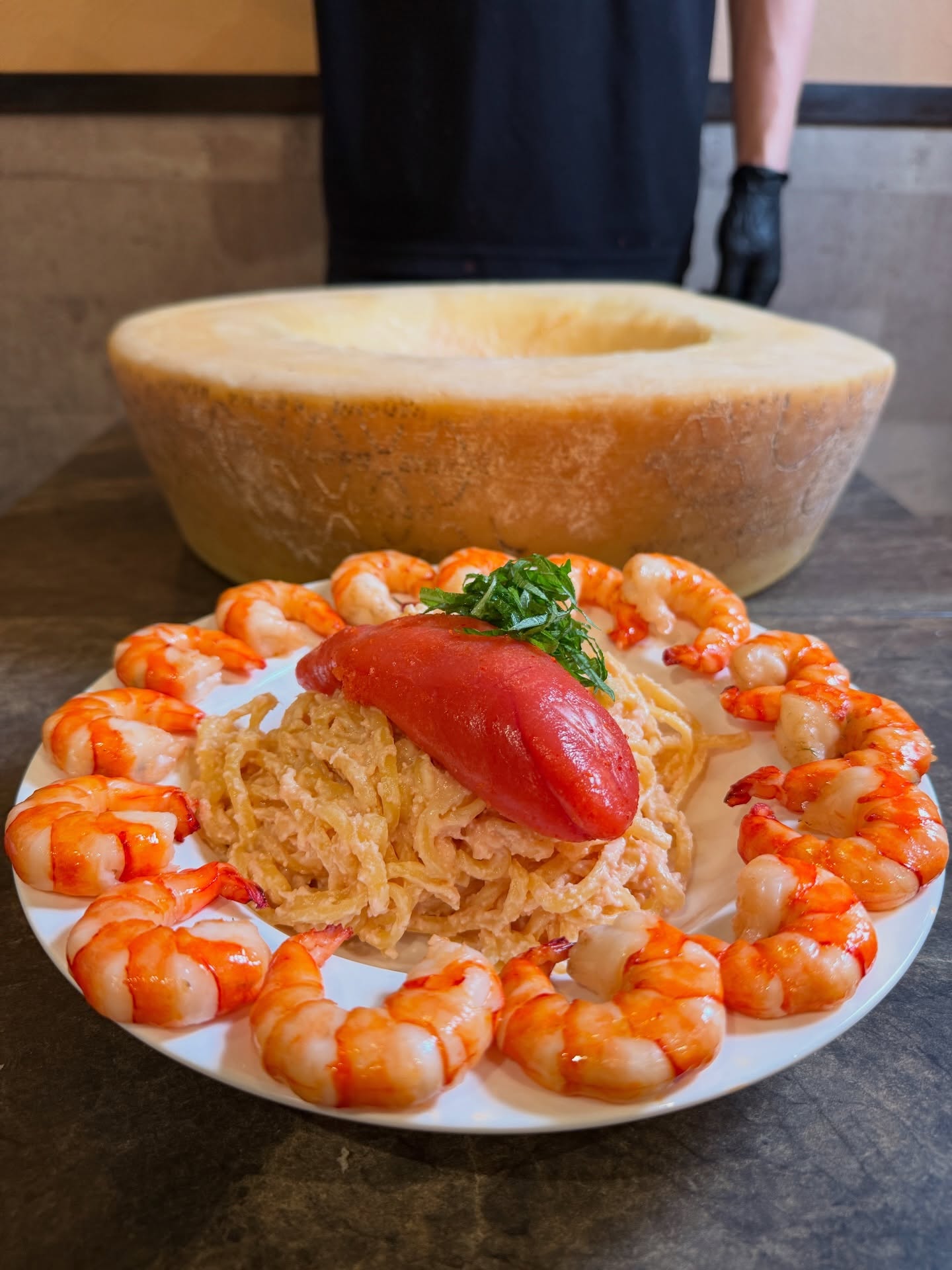 熱々の明太子クリームパスタを12キロの巨大グラナパダーノチーズに乗せてチーズを絡めていきます。明太子丸ごと1本を潰してお召し上がりください。