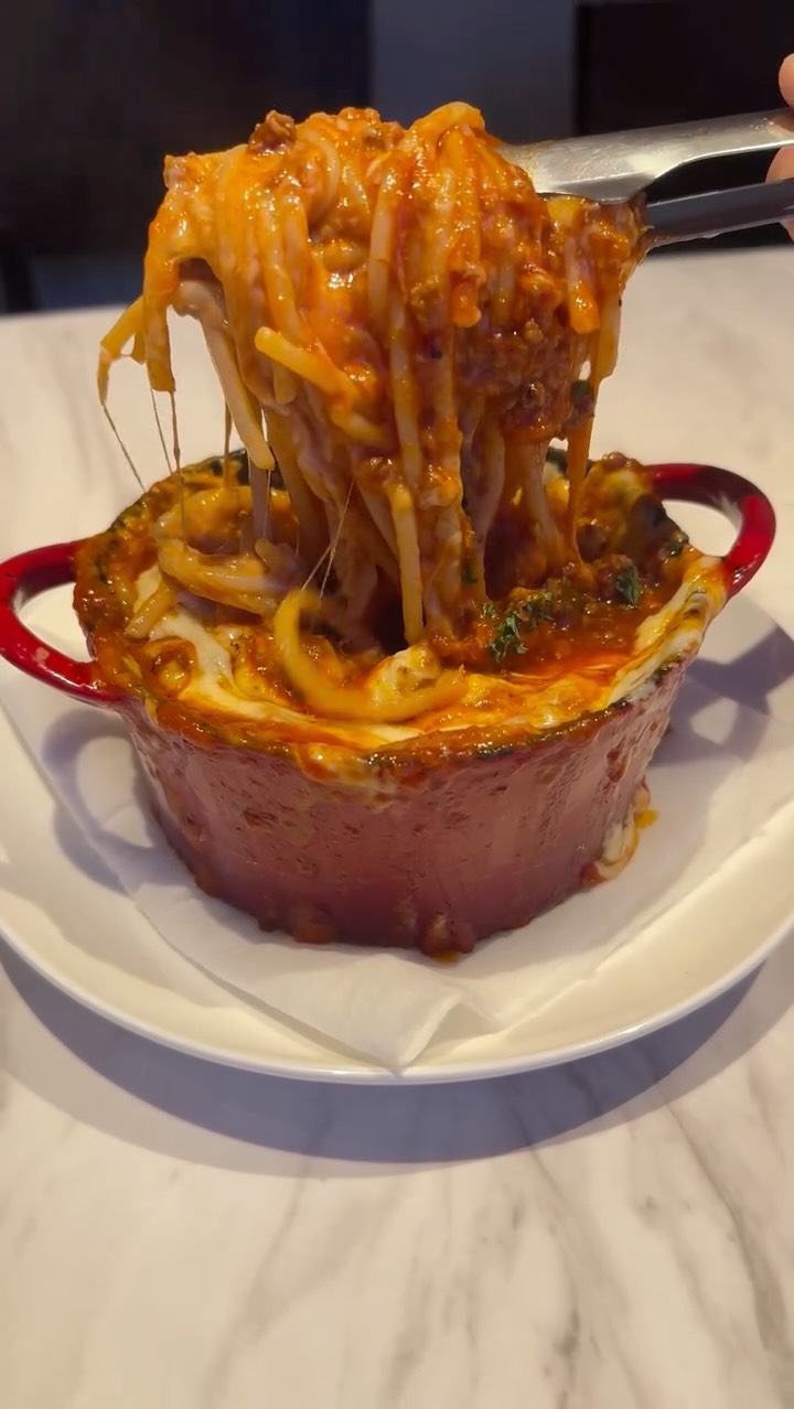 とろ〜りチーズが止まらない🧀️ 熱々ジューシーなミートソースと一緒に、