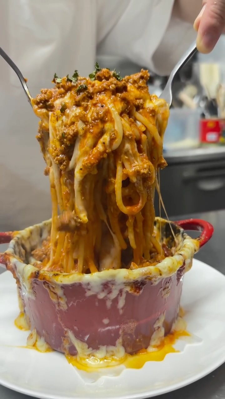 とろ〜りチーズが止まらない🧀️ 熱々ジューシーなミートソースと一緒に、