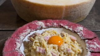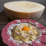 熱々のカルボナーラを12キロの巨大グラナパダーノチーズに乗せてチーズを絡めていきます。北海道産サーロイン肉のローストビーフとからめてお召し上がりください。