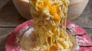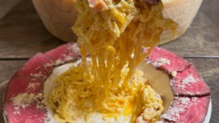 熱々の明太子クリームパスタを12キロの巨大グラナパダーノチーズに乗せてチーズを絡めていきます。明太子丸ごと1本を潰してお召し上がりください。