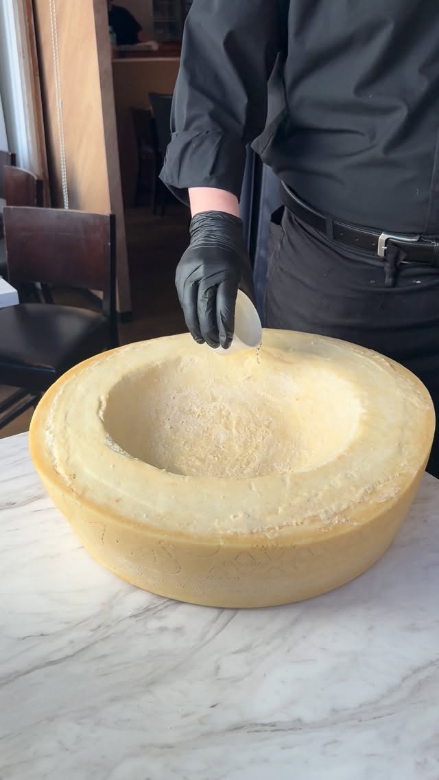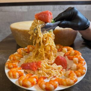 熱々のカニカルボナーラを12キロの巨大グラナパダーノチーズに乗せてチーズを絡めていきます。