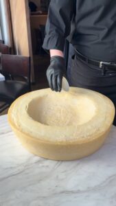 熱々のカニカルボナーラを12キロの巨大グラナパダーノチーズに乗せてチーズを絡めていきます。