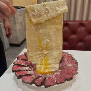 チーズの下には、粗挽き肉がゴロゴロ入ったボロネーゼが入っており、太麺にミートソースとチーズが絡んで良い香りが漂います。