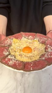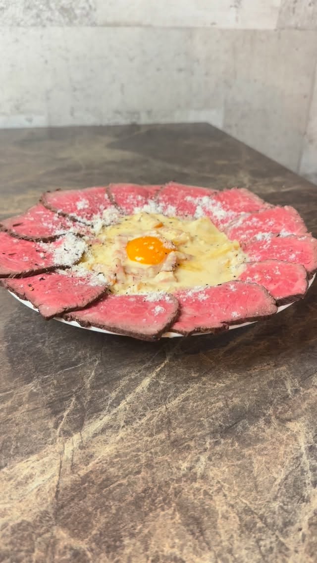 卵黄の下には、一枚麺とゆう帯上のパスタが折りたたんで入っており、麺を持ち上げるときのインパクトはすごいです!味はカルボナーラで、周りのローストされたサーロイン肉と絡めて食べる至極の幸せを是非ご堪能くださいませ。